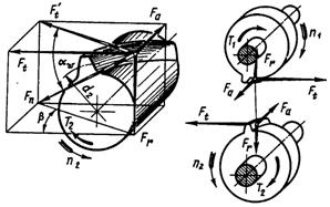 Рис. 5.6. Силы в косозубой цилиндрической передаче.