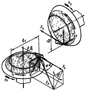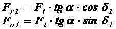Рис. 5.7. Силы в прямозубой конической передаче. |