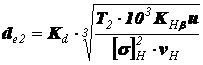где Kd = 165 – вспомогательный коэффициент; T2 – вращающий момент на зубчатом колесе (на выходном валу), Нм; KHb - коэффициент неравномерности распределения нагрузки по длине зуба, зависящий от твердости поверхностей зубьев и характера закрепления валов, несущих зубчатые колеса передачи; [s]H – допускаемые контактные напряжения для материалов из которых изготовлены зубчатые колеса; vH – коэффициент, учитывающий ослабление зубьев конической передачи по сравнению с цилиндрической, для прямозубой конической передачи vH = 0,85; u - необходимое передаточное число конической зубчатой передачи.