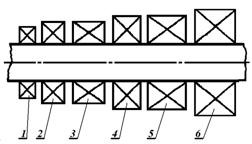 Рис. 11.3. Серии диаметров и ширин подшипников качения: 1) особо лёгкая; 2) лёгкая; 3) лёгкая широкая; 4) средняя; 5) средняя широкая; 6) тяжёлая. |