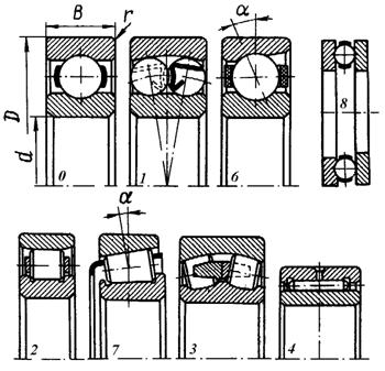 Рис. 11.5. Некоторые типы подшипников качения: верхний ряд – шариковые; нижний ряд– роликовые (тип подшипника указан цифрой).