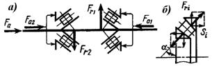 Рис. 11.6. Схема к определению сил, действующих на радиально-упорные подшипники(пояснения в тексте).