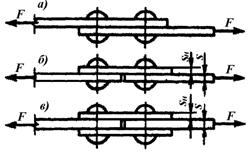 Рис. 12.2. Основные типы заклёпочных швов: а –нахлёсточный; б – стыковой с одной накладкой; в – стыковой с двумя накладками.