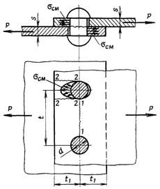 4. Под действием касательных напряжений в теле склёпываемых листов возможен вырыв (срез) части металла склёпываемых листов (часть листа, ограниченная сечениями 2-2, рис. 12.5).