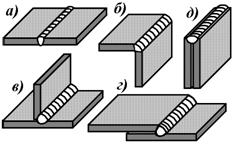 Рис. 12.6. Типы сварных соединений: а) стыковое; б) угловое; в) тавровое; г) нахлёсточное; д) торцовое |