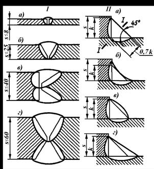 По форме поперечного сечения сварные швы делятся на стыковые (рис. 12.7, I) и угловые (рис. 12.7, II). Кроме того, поперечное сечение шва зависит от формы подготовки кромок под сварку. Так, например, в стыковых соединениях применяются швы с отбортовкой кромок, без скоса кромок (рис. 12.5, Iа), с V -образной разделкой кромок (рис. 12.7, Iб) с K -образной разделкой кромок (рис. 12.7, Iв) X -образной разделкой кромок (рис. 12.7, Iг). Швы с разделкой кромок применяются и в других видах соединений. Форма разделки кромок зависит от толщины свариваемого металла, от вида сварки (ручная или автоматическая), от способа защиты расплавленного металла от окисления (сварка под слоем флюса, сварка в среде защитных газов и т.п.) и некоторых других факторов. Для наиболее распространённых видов сварки (ручная плавящимся электродом, полуавтоматическая и автоматическая под слоем флюса и др.) разделка кромок стандартизована.