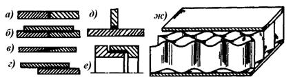 Рис. 12.9. Некоторые типы паяных соединений: а) - встык; б) - встык с накладкой; в) - в косой стык; г) - внахлёстку; д) - втавр; е) -телескопическое; ж) - сотовая конструкция.