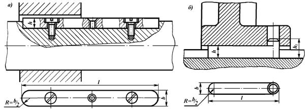 Рис. 14.2. Подвижные соединения призматической шпонкой: а) направляющая шпонка; б) скользящая шпонка.
