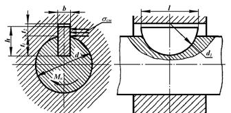 где T – передаваемый соединением крутящий момент; d – диаметр вала; lр – рабочая длина шпонки (без учета длины закруглённых торцов); h – высота шпонки; t1 – величина заглубления шпонки в паз вала.