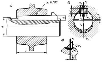 В этих двух выражениях q – давление на контактирующих поверхностях, МПа; d и l – диаметр и длина контактирующих поверхностей соединения, мм; f – коэффициент трения между контактирующими поверхностями (для стального вала и чугунной ступицы f = 0,10…0,15).