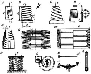 Пружины (рис. 16.1, а…м) – упругие элементы, предназначенные для создания (восприятия) сосредоточенной силовой нагрузки.
