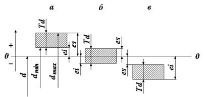 Рис. П1.2. Схема расположения полей допусков вала относительно нулевой линии (номинальной поверхности): а -выше; б - симметрично; в - ниже; ei - нижнее отклонение; es - верхнее отклонение; Td - поле допуска размера. |