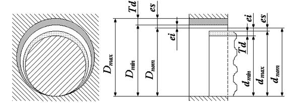 Рис. П1.1. Схема расположения полей допусков при посадке с зазором; Dnom, Dmax, Dmin -номинальный, максимальный и минимальный диаметры отверстия; dnom, dmax, dmin -номинальный, максимальный и минимальный диаметры вала; es -верхнее отклонение, ei -нижнее отклонение размера; Td -поле допуска размера. |