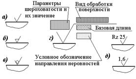 Рис. П1.7 Обозначение шероховатости на чертежах: а) вид механической обработки не устанавливается (предпочтительно); б) механическая обработка со снятием слоя материала; в) без механической обработки; г) поля для простановки параметров шероховатости и способа обработки поверхности; д) простановка размеров профиля. |