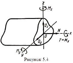 По характеру создаваемой деформации силовые факторы называют осевой силой N, поперечными силами Qy и Qz, крутящим моментом T, изгибающими моментами My и Mz.