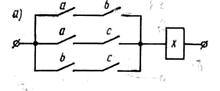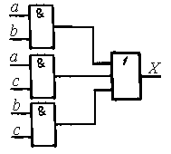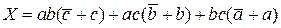 Пример. Пусть работа объекта контролируется тремя датчиками. Условия работы системы: на выходе логического устройства должен появиться сигнал, приводящий в действие исполнительный элемент X, если на вход поступают два из трех любых сигналов или все три сигнала (мажоритарная функция, схема голосования два из трех).