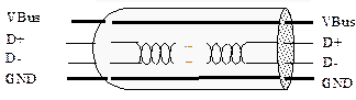 В шине USB сигнал и питание передаются по четырехпроводному кабелю, показанному на рис. 2.9. Передача сигналов происходит по двум проводам и только от точки к точке. Сигналы в каждом сегменте являются дифференциальными и передаются по кабелю с импедансом 90 Ом. Чтобы обеспечивать гарантируемые входные уровни напряжения и соответствующий импеданс, используются согласующие сопротивления на каждом конце кабеля. Максимальная длина кабеля 5 м. Чувствительность дифференциального приемника шинных сигналов не менее 200 мВ.