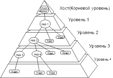 Шина USB соединяет устройства с хостом. На физическом уровне топология USB представляется в виде многоуровневой звезды. В центре каждой звезды находится концентратор (hub). Каждый сегмент провода - двухточечное соединение между хостом и концентратором или устройством, или концентратором соединенным с другим концентратором или устройством. Топология шины USB показана на рис. 2.10.