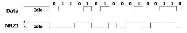 Для передачи битов данных USB использует NRZI кодирование, смысл использования таких кодировок состоит в упрощении синхронизации передающих и приемных устройств. Подобные кодировки обеспечивают повышенное количество переходов между уровнями логического нуля и единицы по сравнению с непосредственной передачей битовой последовательности.