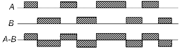 Сеть, построенная на интерфейсе RS -485, представляет собой приемопередатчики, соединенные при помощи витой пары. В основе интерфейса RS -485 лежит принцип дифференциальной или балансной передачи данных. Суть его заключается в передаче одного сигнала по двум проводам. Причем по одному проводу (условно A) идет оригинальный сигнал, а по другому (условно B) – его инверсная копия. Другими словами, если на одном проводе «1», то на другом «0» и наоборот. Таким образом, между двумя проводами витой пары всегда есть разность потенциалов: при «1» она положительна, при «0» – отрицательна (рис. 2.12).