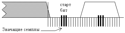 Приемник и передатчик тактируются, как правило, с 16-кратной частотой относительно бодрейта. Это нужно для сэмплирования сигнала. Приемник, поймав падающий фронт старт-бита, отсчитывает несколько тактов и следующие три такта считывает (семплирует) порт Rx. Это как раз середина старт-бита. Если большинство значений семплов – «0», старт-бит считается состоявшимся, иначе приемник принимает его за шум и ждет следующего падающего фронта. После удачного определения старт-бита, приемник точно также семплирует серединки битов данных и по большинству семплов считает бит «0» или «1», записывая их в сдвиговый регистр. Стоп-биты тоже семплируются, и если уровень стоп-бита не «1» – UART определяет ошибку кадра и устанавливает соответствующий флаг в управляющем регистре (рис. 2.14).