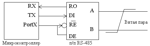 Пример подключения приемопередатчика RS -485 к микроконтроллеру показан на рис. 2.16.