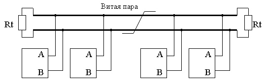 Все устройства подключаются к одной витой паре одинаково: прямые выходы (A) к одному проводу, инверсные (B) – к другому.