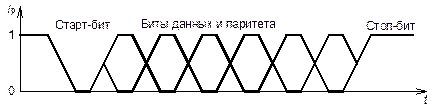Формат передаваемой информации (в битах) следующий: старт – 1; передаваемые данные – 5,7 или 8; четность – 1 или отсутствует; стоп – 1,5 или 2. Формат кадра при последовательном асинхронном протоколе связи приведен на рис. 2.19.