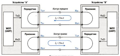 Интерфейс обеспечивает асинхронную передачу постоянным током (токовая петля) по 4-проводной дуплексной связи. В технически обоснованных случаях допустима и цепь взаимосвязи, указывающая состояние устройств. Взаимосвязью называется соединение для передачи последовательных двоичных сигналов с регулярной скоростью, определяемой стандартом или соглашениями.