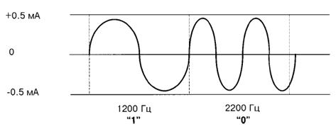 HART протокол использует стандарт BELL 202 кодировки сигнала методом частотного сдвига (FSK), используемого для посылки цифровой информации по телефонным сетям, при этом цифровой сигнал накладывается на аналоговый измерительный сигнал 4÷20 мА. Для представления двоичных «1» и «0» используются две разные частоты, 1200 Гц и 2200 Гц, соответственно (рис. 2.24).