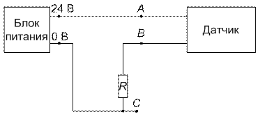 Ручной коммуникатор или коммуникационные схемы главного устройства не должны быть подсоединены непосредственно параллельно источнику питания. Они должны подсоединяться либо к двум проводам первичного прибора в точках А и В, либо через сопротивление нагрузки в точках B и C, в этом случае цепь замыкается через источник питания.