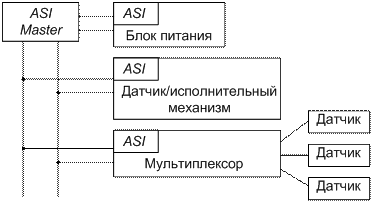 Каждый узел ASI -сети имеет специальную интерфейсную микросхему с поддержкой ASI -протокола. По одной паре проводов интерфейс ASI позволяет передавать как данные, так и питание к узлам сети. Упрощенная схема ASI -сети представлена на рис. 2.27.