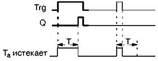 Задержка отключения. На выходе Q устанавливается значение hi сразу же после появления сигнала hi на входе Trg. Текущее время Ta в модуле запускается при изменении состояния вход Trg с 1 на 0, причем выход остается установленным. Выход Q сбрасывается в 0 с задержкой отключения, когда Ta достигает значения, заданного для параметра T, т.е. когда Ta = T. Время Ta перезапускается при включении и отключении входа Trg.