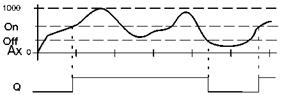 Аналоговый пороговый выключатель. Выход устанавливается и сбрасывается в зависимости от двух настраиваемых пороговых значений.