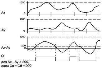 Усиление задается параметром «A» в диапазоне значений ±10,00. Параметр «B» задает смещение нуля в диапазоне значений ±10000. Порог включения и отключения задаются параметрами «On» и «Off», соответственно, диапазон значений каждого параметра ±20000. Число разрядов после десятичной точки устанавливает параметр «p», который принимает значения 0, 1, 2, 3. Временная диаграмма работы аналогового порогового выключателя показана на рис. 5.16.