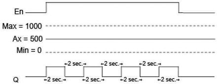 Аналоговое значение 500 (диапазон 0÷1000) в качестве значения Ax должно быть преобразовано в последовательность цифровых сигналов. Заданный пользователем интервал времени T составляет 4 секунды. На цифровом выходе функции PWM сигнал 2 секунды имеет высокое значение, 2 секунды низкое значение, до тех пор, пока на входе En сохраняется высокий уровень.