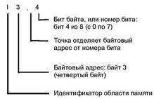 | Бит: | I [адрес байта].[адрес бита] | I 0.1 |
