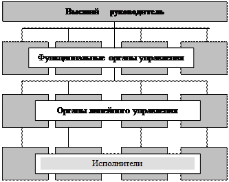 Самой распространенной на сегодняшний день является линейно - функциональная структура управления (Рис.5). Основу линейно-функциональных структур составляет принцип построения и специализации управленческого процесса по функциональным подсистемам организации, каждая из которых имеет свою четко определенную конкретную задачу и обязанности. Характерными чертами линейно-функциональной структуры при этом являются: