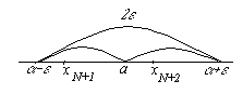 Следовательно, постоянное число a есть предел числовой последовательности { xn }, если для любой малой окрестности с центром в точке a радиуса ε (ε – окрестности точки a) найдется такой элемент последовательности с номером N, что все последующие элементыс номерами n>N будут находиться внутри этой окрестности.