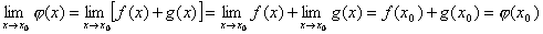 Теорема 1. Если функции f(x) и g(x) непрерывны в точке x0, то их сумма φ(x) = f(x) + g(x) также есть непрерывная функция в точке x0.
