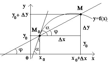 Рассмотрим теперь непрерывную функцию y=f(x) и соответствующую этой функции кривую. При некотором значении х 0 функция принимает значение y0=f(x0). Этим значениям x 0 и y 0 на кривой соответствует точка М0(x0; y0). Дадим аргументу x0 приращение Δ х. Новому значению аргумента соответствует наращенное значение функции y 0+Δ y=f(x 0–Δ x). Получаем точку М(x0 +Δ x; y0 +Δ y). Проведем секущую М0М и обозначим через φ угол, образованный секущей с положительным направлением оси Ox. Составим отношение