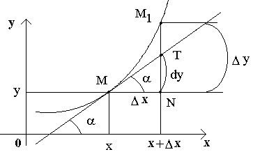 Рассмотрим функцию y=f(x) и соответствующую ей кривую. Возьмем на кривой произвольную точку M(x; y), проведем касательную к кривой в этой точке и обозначим через α угол, который касательная образует с положительным направлением оси Ox. Дадим независимой переменной x приращение Δ x, тогда функция получит приращение Δ y = NM 1. Значениям x +Δ x и y +Δ y на кривой y = f(x) будет соответствовать точка