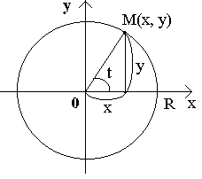 Таким образом, получаем окружность с центром в начале координат, радиуса R. Здесь t обозначает угол, образованный радиусом, проведенным в некоторую точку окружности М(x, y), и осью Ox.