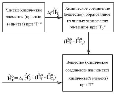 Энтальпия любого вещества при температуре Т будет равна количеству теплоты, которое необходимо подвести в изобарном процессе, чтобы из чистых химических элементов при температуре Т 0 получить данное вещество и нагреть его от температуры Т 0 до температуры Т, т.е. формула для расчета энтальпии любого вещества имеет вид:
