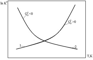 . При росте температуры эндотермические химические реакции сдвигаются в сторону продуктов ХР, (вправо), а экзотермические ХР (реакции горения) – в сторону исходных веществ (влево), как это видно из приведенного рисунка.