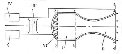 ). Горючее и окислитель впрыскиваются в камеру сгорания ЖРД через форсунки VI и определяют состав смеси газов в сечении 2-2 камеры сгорания. Термодинамические параметры в сечениях 2-2 - вход в камеру сгорания, 3-3 – вход в сопло, 4-4 - срез сопла соответствуют термодинамическим параметрам в точках 2, 3 и 4 разомкнутого цикла ЖРД, процессы которого в координатах pV и TS имеют следующий вид: