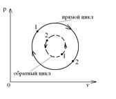 Циклы тепловых двигателей – прямые циклы, требующие для своего осуществления затраты теплоты. В них линия расширения лежит выше линии сжатия в p-v координатах, т.е. прямые циклы направлены по часовой стрелке, как показано на рисунке