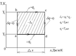 Холодильная установка работает по обратному циклу Карно. Для его осуществления необходимо затратить работу (- lц).
