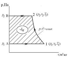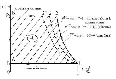 где А-1 – линия всасывания; 1-2 – процесс сжатия газа; 2-В – линия нагнетания сжатого газа в баллон; (- L) – работа, затрачиваемая на привод компрессора.