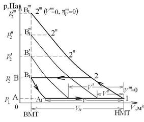 где процесс В1-А1 – это процесс расширения газа, оставшегося во вредном пространстве; т.А1 – фактическое начало всасывания газа. С ростом давления р 2 объемный кпд компрессора
